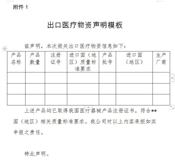中新经纬客户端打开出口医疗物资声明模板发现,内容包括产品名称、产品数量、注册证号、进口国(地区)质量标准要求、产品批号、进口国(地区)、生产厂商。