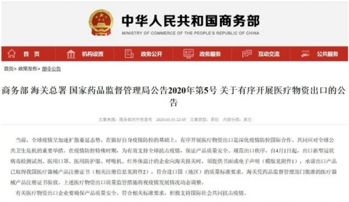 公告称,当前,全球疫情呈加速扩散蔓延态势。在做好自身疫情防控的基础上,有序开展医疗物资出口是深化疫情防控国际合作、共同应对全球公共卫生危机的重要举措。在疫情防控特殊时期,为有效支持全球抗击疫情,保证产品质量安全、规范出口秩序,自4月1日起,出口新型冠状病毒检测试剂、医用口罩、医用防护服、呼吸机、红外体温计的企业向海关报关时,须提供书面或电子声明,承诺出口产品已取得我国医疗器械产品注册证书,符合进口国(地区)的质量标准要求。