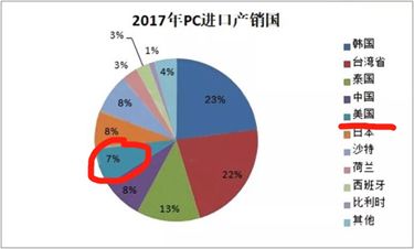 为应对美国的贸易战,2018年4月4日,经国务院批准,国务院关税税则委员会决定对原产于美国的大豆、汽车、化工品(包含PC等多种化工品)等14类106项商品加征25%的关税,实施日期另行公布。2017年中国从美国进口10.3万吨PC塑料,占总进口量的7.44%,居进口来源国第五位。美国PC料占市场份额虽不如韩国、台湾、泰国等占比大,但是10.3万吨(约合30亿人民币)也有不小的影响。因为PC做为大宗商品,25%的关税加征,对美国PC出口商的产品竞争力是极大的打击。