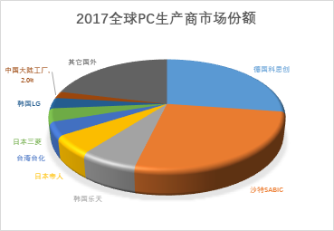 2017年全球PC的使用量约400万吨,按照人民币3万/吨的均价,约合1200亿人民币。怎么样,1200亿,这个数字您还看得上眼吧。PC广泛应用于我们生活的方方面面,您此刻拿着的手机,旁边的电脑电视,乘坐的汽车都是PC的典型应用领域。可是您知道这1200亿的PC塑料有多少是咱们中国大陆企业生产的吗?24亿,没错,2%的市场份额来自中国大陆的生产商,比大家“芯通”了好多天的芯片产业没有好多少。